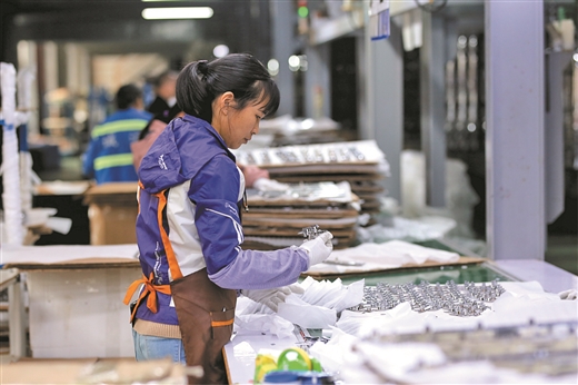 在柳州市德福德表面處理技術有限公司,工人復檢電鍍好的汽車配件。